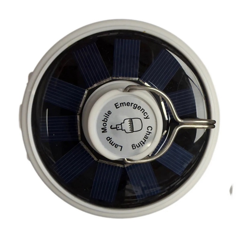 در بالای این چراغ حلقه آویزی برای نصب راحت وجود دارد. نوع شارژ این لامپ به صورت خورشیدی توسط پنل تعبیه شده در بالای آن و آداپتور است و دارای علامت پر بودن شارژ در قسمت بالای لامپ به صورت نور می باشد.